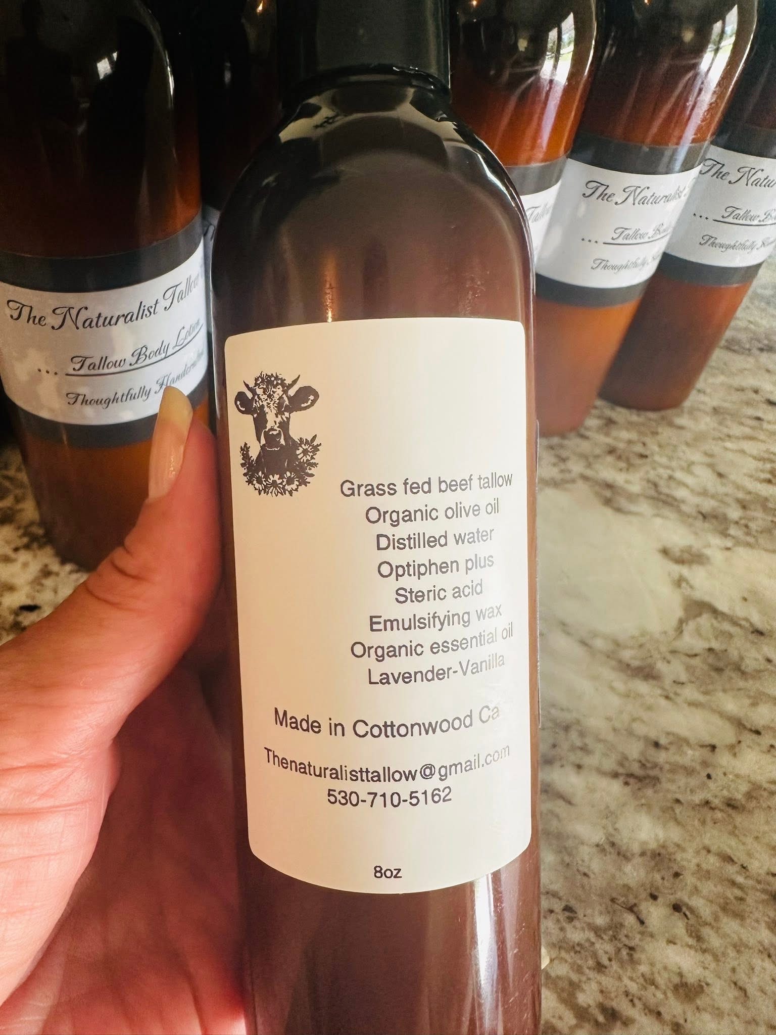 Handcrafted in small batches using grassfed and finished beef tallow. Organic extra virgin cold pressed olive oil, distilled water, non GMO natural emulsifying wax, organic steric acid.