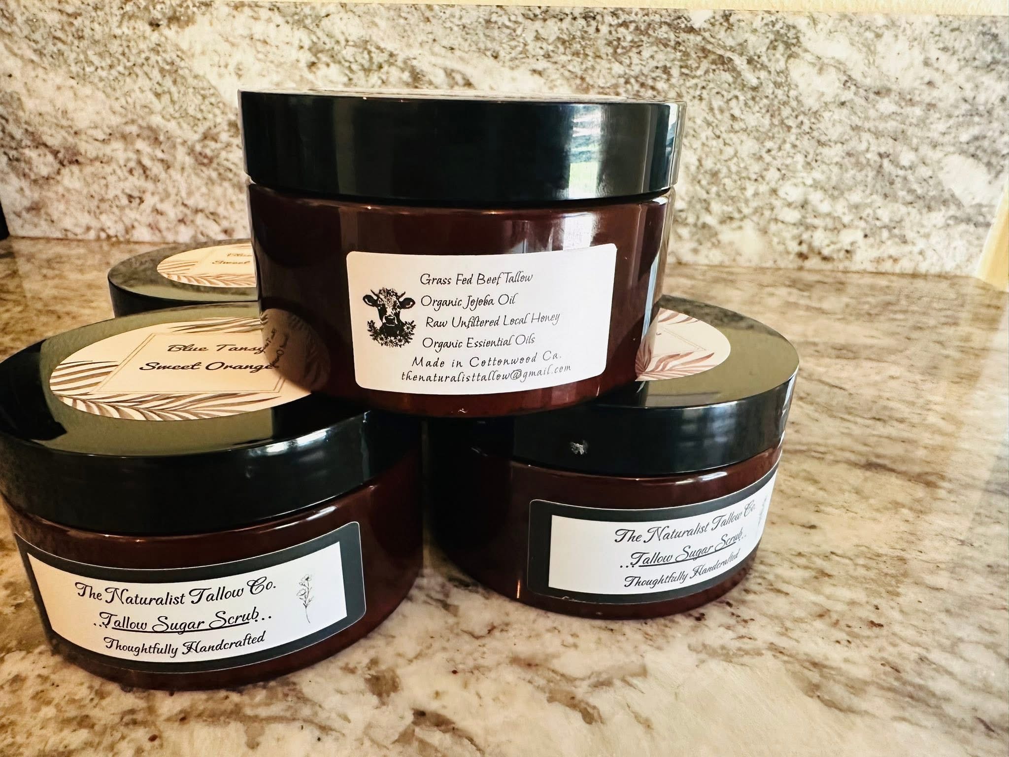 Handcrafted in small batches using grassfed and finished beef tallow, organic jojoba oil, organic pure cane sugar, locally sourced honey, organic arrowroot powder and organic essential oils.